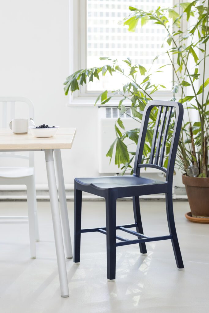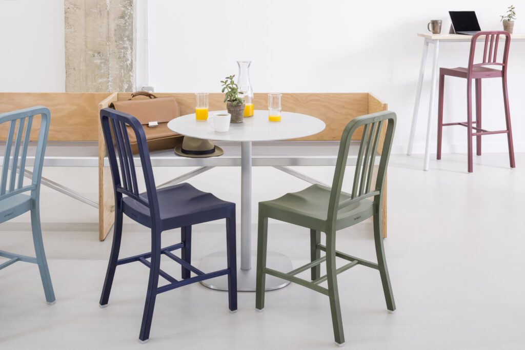 Emeco introduces four new colors for the 111 Navy collection. First introduced in 2010, the 111 Navy Chair® was developed together with Coca-Cola and is the world’s first structural object made from recycled plastic bottles (rPET). By upcycling the bottles into a strong, classic chair, they are kept out of the waste stream for a long time. What’s more, the material is 100% recyclable without loss of strength. Every year, the 111 Navy collection helps keep millions of bottles out of landfills and oceans. The colors of the original collection were selected to be timeless and, over a decade later, have proved to stand the test of time. They are now joined by four fresh, yet timeless, colors; Bordeuax, Cypress Green, Dark Blue, and Light Blue . All are approved for outdoor use. All are made in the USA. The 111 Navy family consists of chairs, stools, and a mini chair. All of them areBifma certified for use in high-traffic settings, from hospitality projects to higher education and workplaces.
