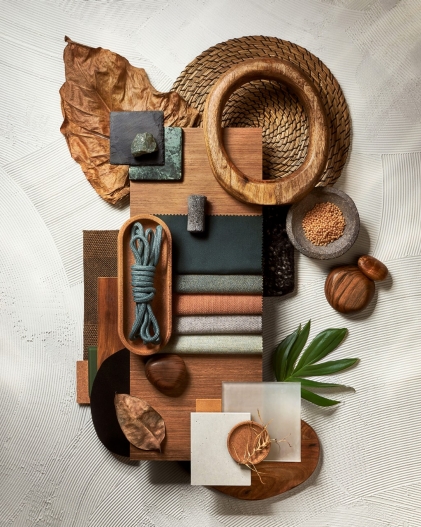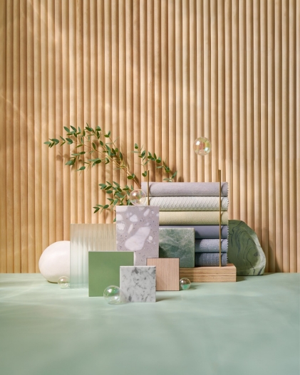 The Sensorial Wellness trend focuses on creating inclusive, multisensory experiences for individuals with various sensory abilities. Serene shades of blues, greens, and soothing beiges, paired with varying degrees of gray, set a calming ambiance. These colors are complemented by light wooden tones and natural stone elements, infusing a sense of warmth and softness.