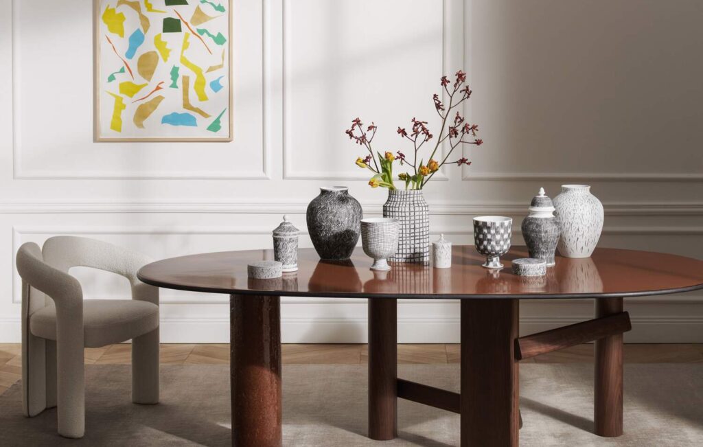 The collection includes a series of different-shaped vases, and contemporary pieces that can stand alone or be combined to create graphic compositions.
