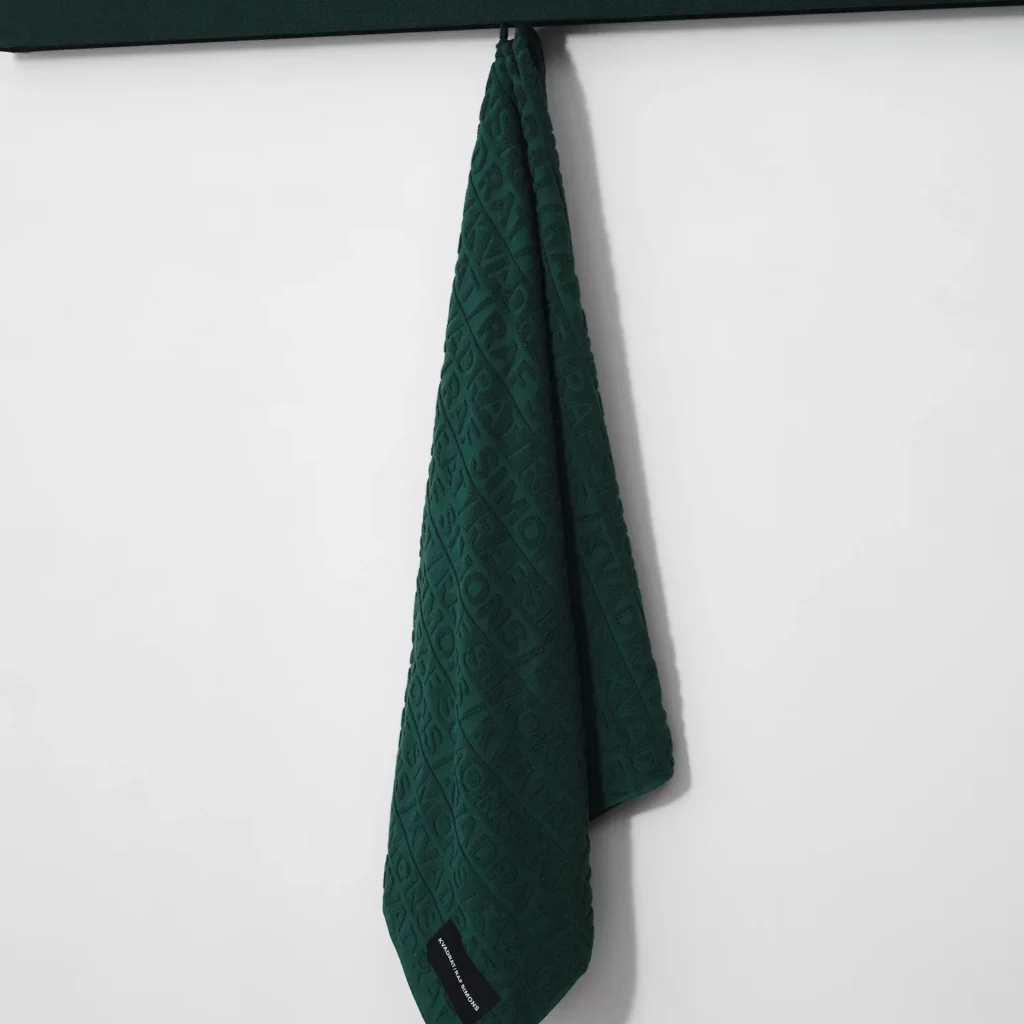 A towel in terry cloth with a Kvadrat/Raf Simons logo in the jacquard pattern. Generously sized for wrapping the whole body.