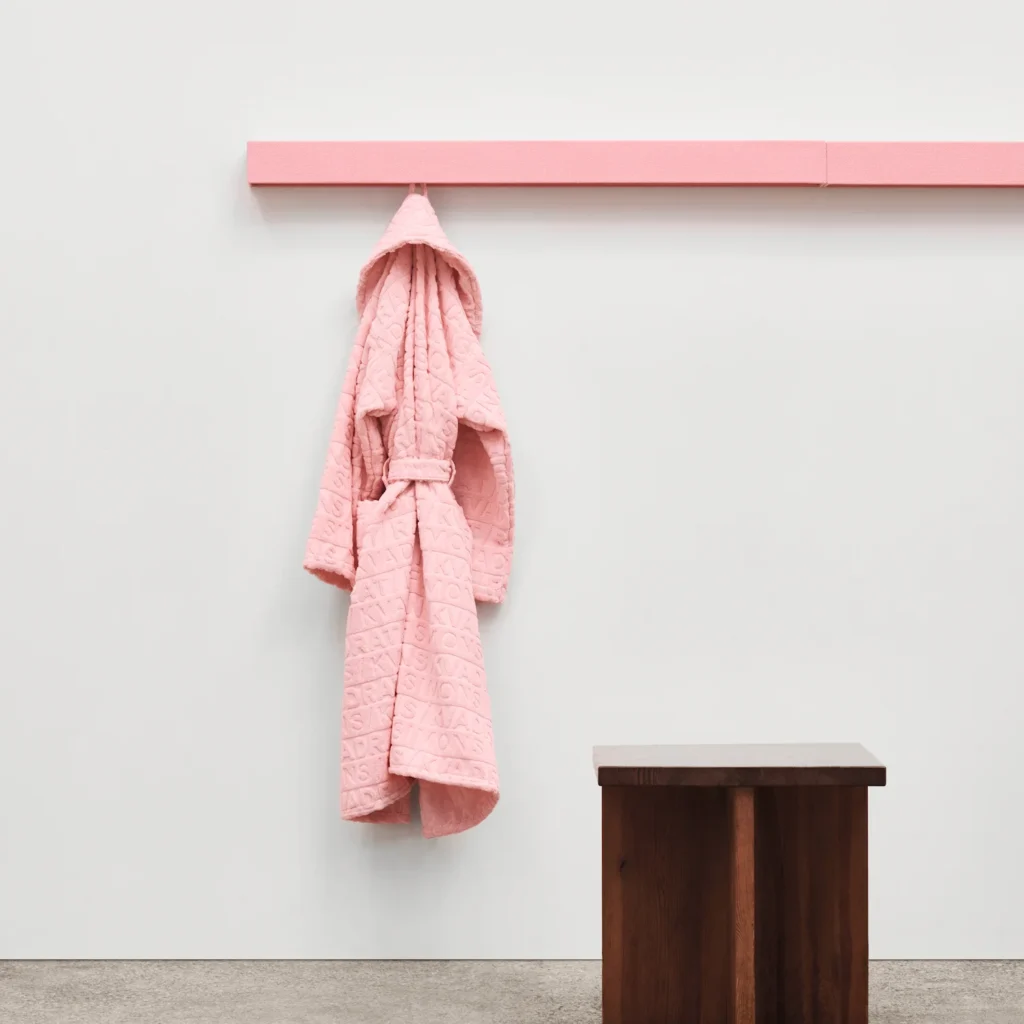 A shawl-collared bathrobe in terry cotton with a Kvadrat/Raf Simons logo shaved in the jacquard pattern. Designed for wrapping the whole body, it is oversized and generously long.